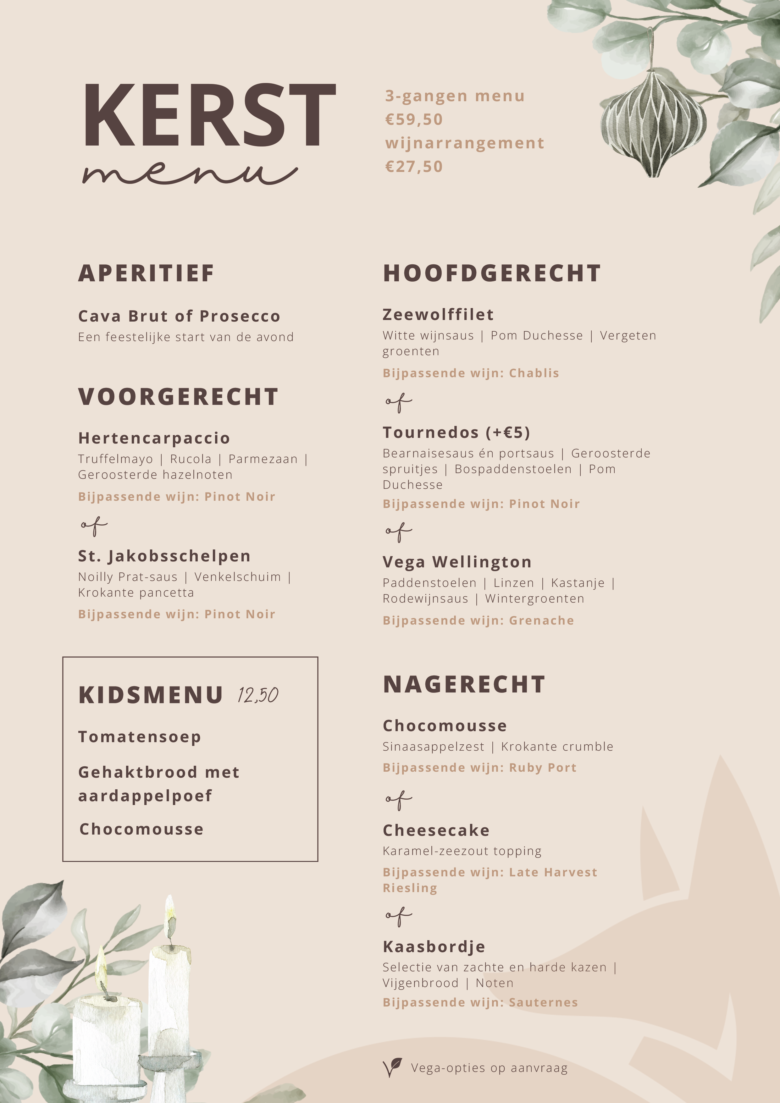 Eetcafé 't Vöske serveert op eerste en tweede kerstdag een 3-gangen kerstdiner voor € 59,50. Een bijpassend wijnarrangement is te verkrijgen voor € 27,50